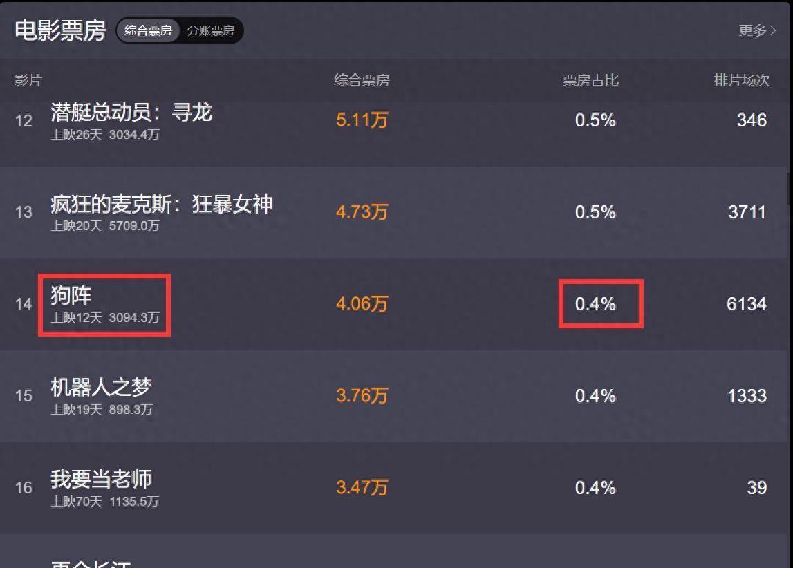 没错,这部电影等于《狗阵》,管虎压了三年的电影,憋了那么久的电影,不应该票房得益很烂才对,可咱们一看电影票房,上映12天的期间,累计票房唯有3094.3万,什么意见?绝顶于管虎这部电影分红票房也就1000多万,再抛掉其他一些开支后,管虎的这部电影,估摸着连主演的盒饭钱都莫得赚总结,当今的占比只剩下了0.5%,往后也别思有太大的起色了。